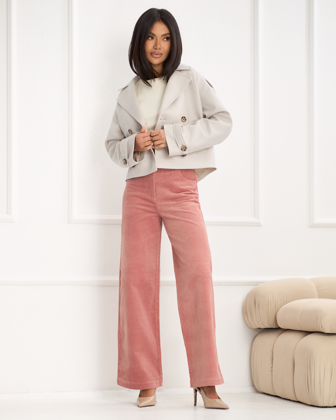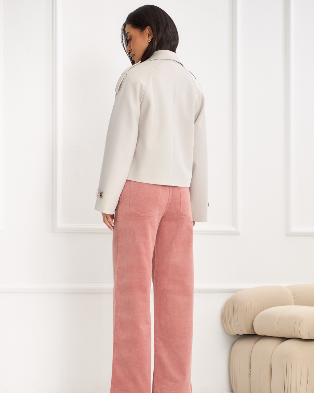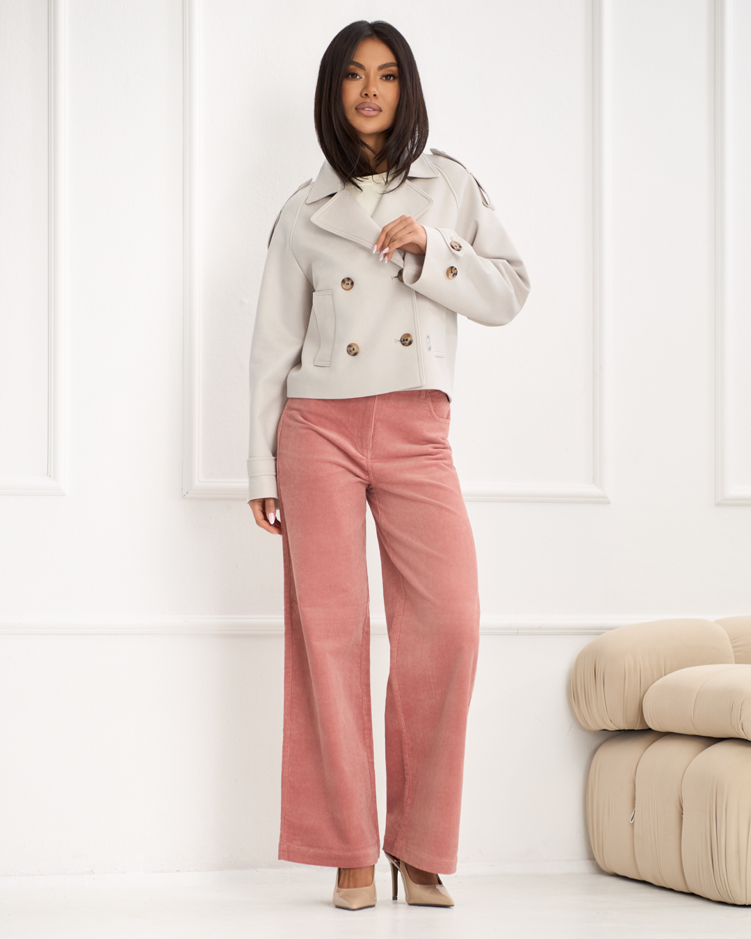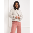 Alba to krótki płaszcz o lekko swobodniejszym kroju, który łączy elegancję z nowoczesnym, miejskim charakterem. Model zapinany dwurzędowo na guziki wyróżnia się klasycznym kołnierzem z klapami oraz dopracowanymi detalami inspirowanymi stylem trencza. Patki na ramionach oraz rękawach podkreślają modowy charakter płaszcza, a kieszenie z patką dodają mu funkcjonalności i stylowego wyrazu. Długość do bioder sprawia, że Alba doskonale komponuje się zarówno z casualowymi, jak i bardziej eleganckimi stylizacjami. Model wykończony podszewką - idealny wybór na wiosenny sezon.