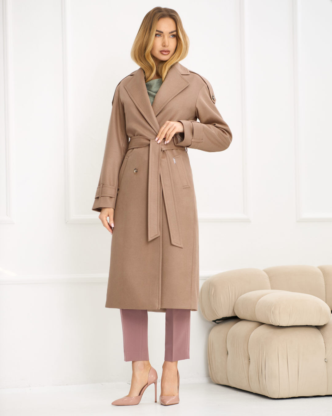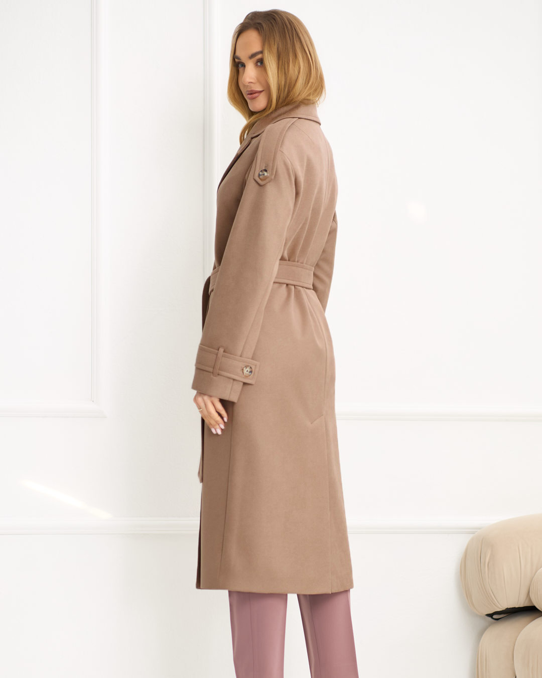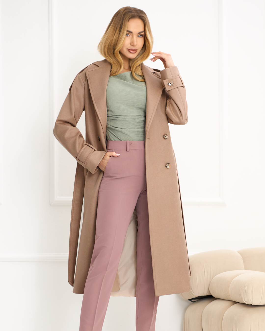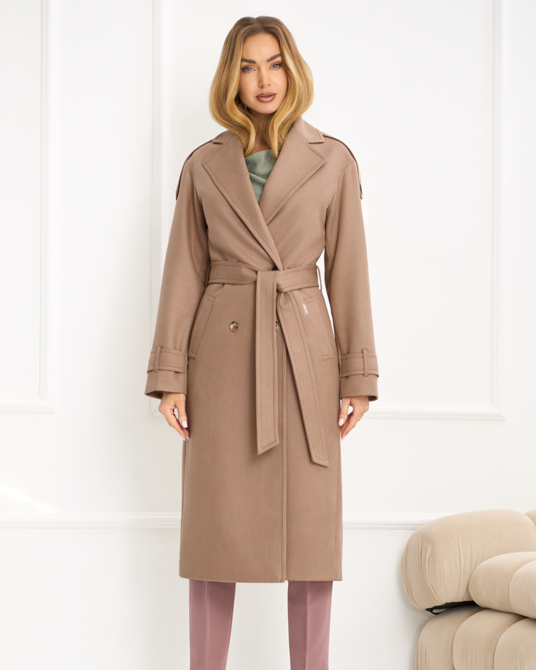 Dallas to płaszcz o swobodniejszym kroju, który świetnie odnajduje się w nowoczesnych, stylowych stylizacjach. Klasyczny kołnierz z klapami w połączeniu z dwurzędowym zapięciem na guziki nadaje mu ponadczasowej elegancji, a wiązany pasek w talii umożliwia indywidualne dopasowanie fasonu i delikatne zaakcentowanie sylwetki. Raglanowe rękawy zapewniają komfort noszenia, patki na ramionach i rękawach dodają stylowego akcentu, a rozporek z tyłu podkreśla lekkość kroju. Długość do połowy łydki oraz podszewka sprawiają, że model doskonale sprawdzi się w sezonie wiosennym i jesiennym.