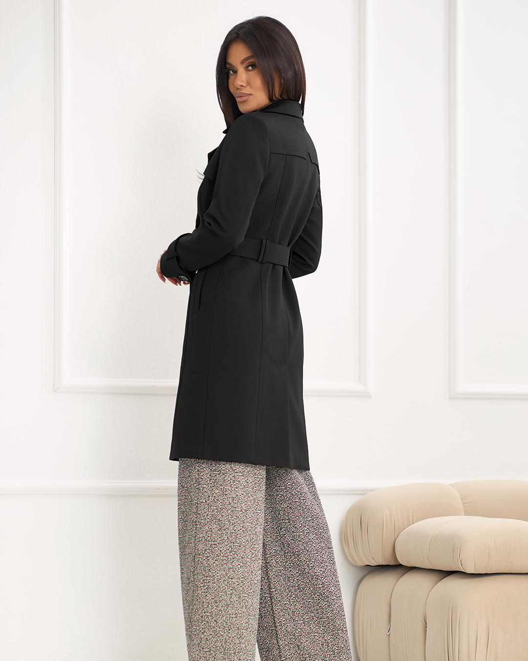 Mia to płaszcz o klasycznym fasonie trencza z dwurzędowym zapięciem i kołnierzem z klapami, które nadają mu ponadczasowego charakteru. Pasek w talii pozwala podkreślić kobiece proporcje. Boczne kieszenie dodają praktyczności, a rozporek z tyłu zapewnia wygodę i swobodę ruchu. Długość przed kolano sprawia, że prezentuje się lekko i nowocześnie. Wykończony podszewką. Mia to idealny wybór na wiosnę i lato - dla kobiet, które cenią styl, wygodę i uniwersalność w codziennych stylizacjach.