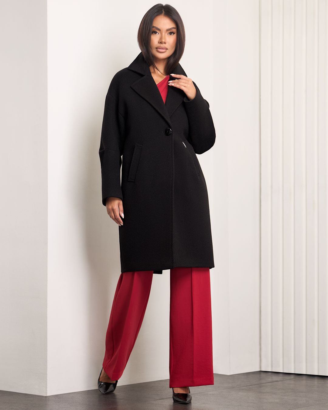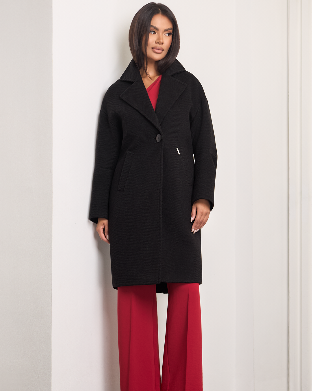 Neya to model pudełkowy o prostym, nowoczesnym fasonie, który zachwyca minimalizmem i wygodą. Opuszczona linia ramion dodaje lekkości i nonszalancji, pojedynczy guzik subtelnie podkreśla elegancję całości. Kieszenie po bokach wprowadzają nutę praktyczności, a rozporek z tyłu zapewnia swobodę ruchu. Dzięki ociepleniu i miękkiej podszewce płaszcz otuli Cię przyjemnym ciepłem, chroniąc przed zimnem w jesienno-zimowe dni. Jego długość przed kolano sprawia, że doskonale komponuje się zarówno z codziennymi, jak i bardziej eleganckimi stylizacjami.