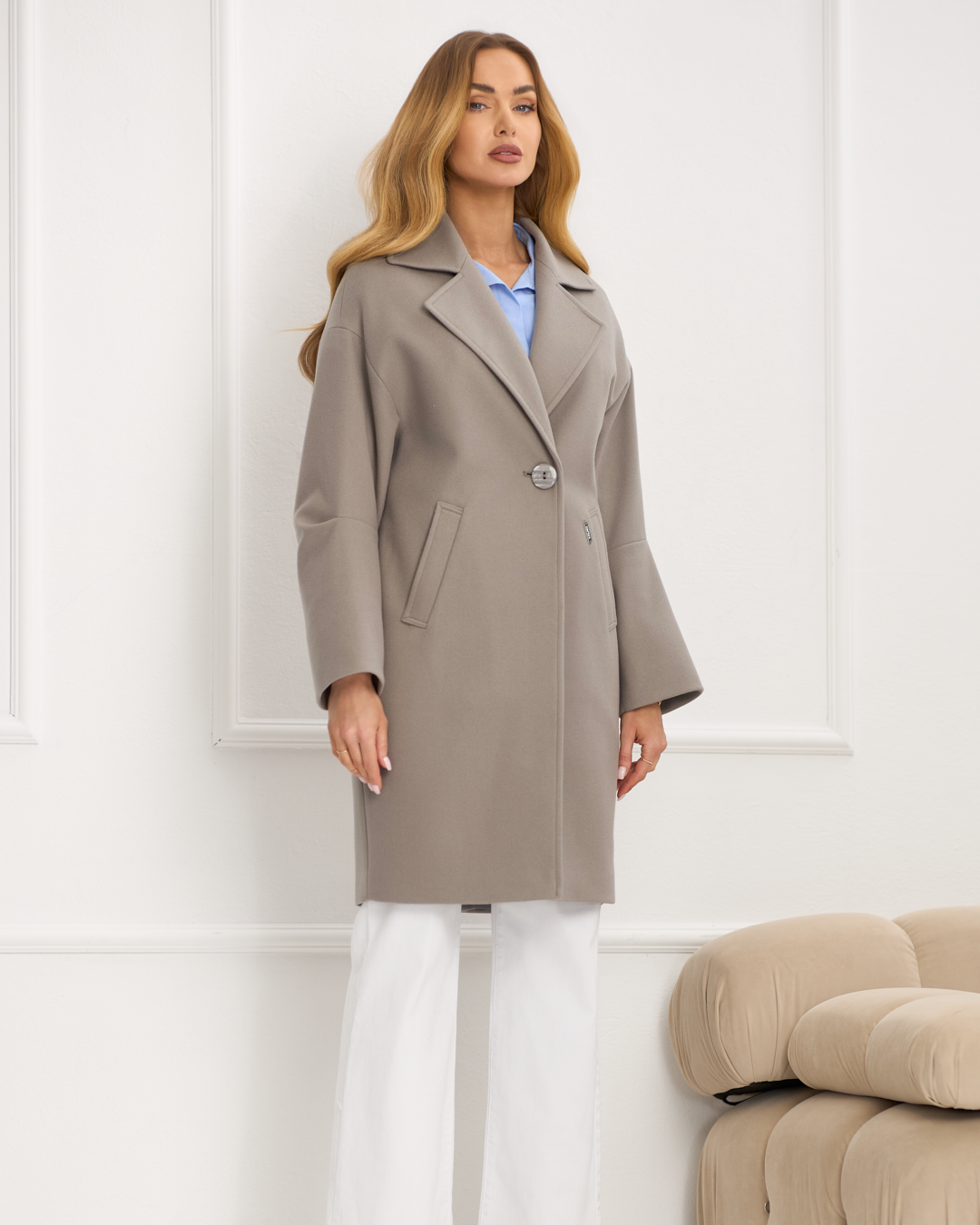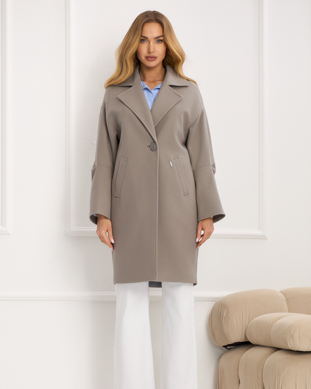Neya to płaszcz, który zachwyca nowoczesną prostotą i modnym szykiem. Pudełkowy fason z opuszczoną linią ramion nadaje mu swobodnej elegancji, a minimalistyczne zapięcie na guzik podkreśla jego ponadczasowy charakter. Kieszenie po bokach dodają funkcjonalności, a rozporek z tyłu zapewnia lekkość i wygodę w ruchu. Długość przed kolano sprawia, że całość prezentuje się lekko i stylowo. Wykończony podszewką, Neya to doskonały wybór dla kobiet, które lubią łączyć komfort z nowoczesną elegancją i zawsze chcą wyglądać modnie.