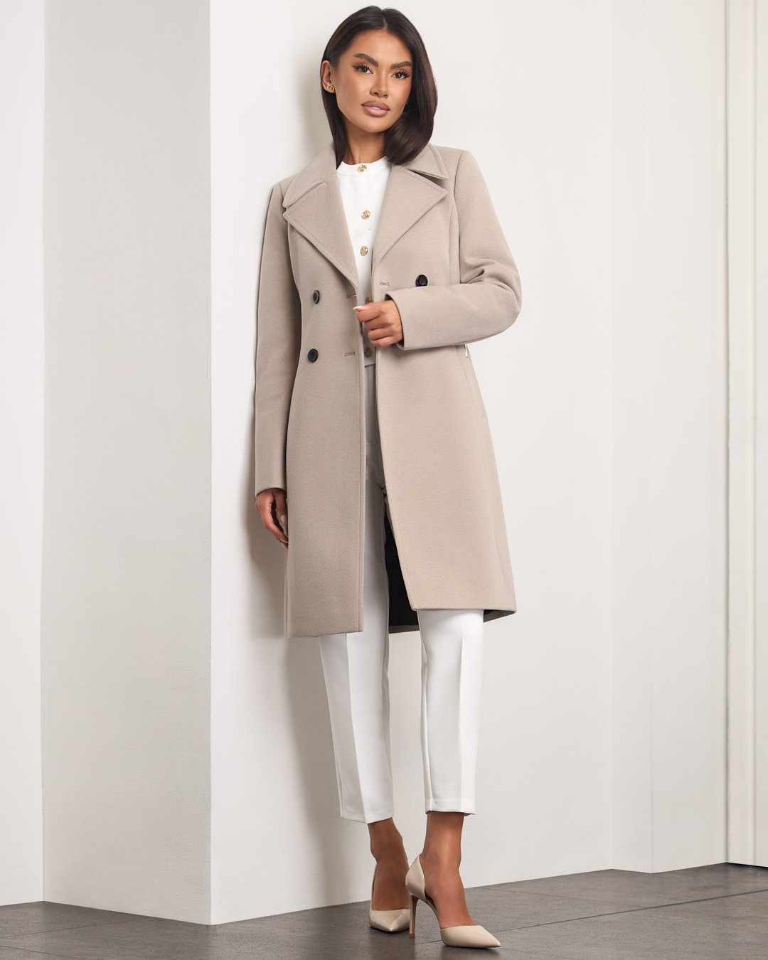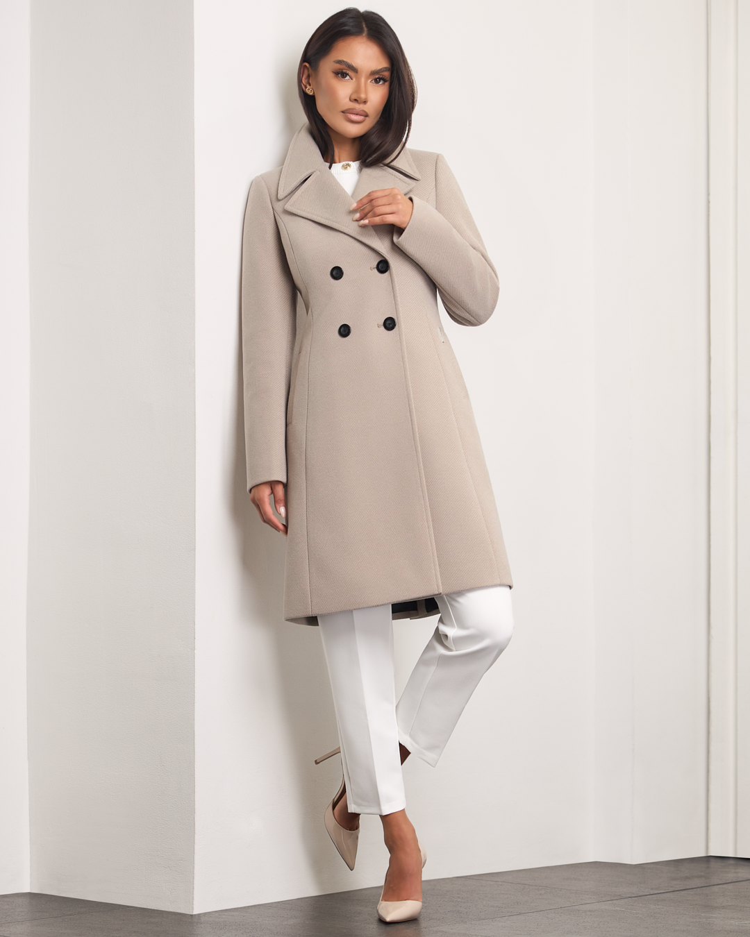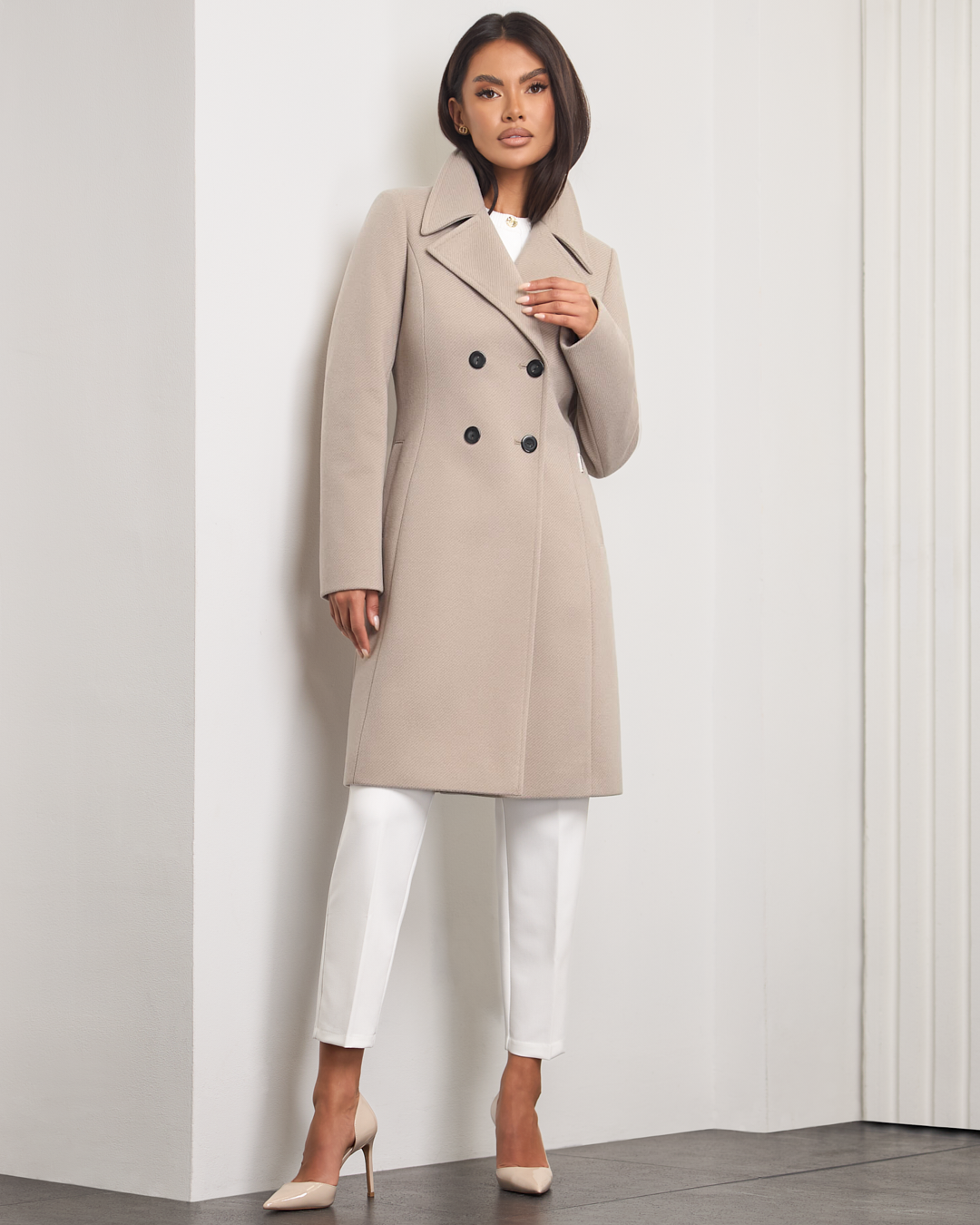 Paris to dopasowany, ocieplany płaszcz o długości przed kolano, który emanuje niepowtarzalnym paryskim szykiem. Dwurzędowe guziki i kołnierz z klapami nadają mu elegancji, a rozporek z tyłu zapewnia lekkość i swobodę ruchu. Kieszenie po bokach łączą funkcjonalność z subtelnym stylem, a ozdobna patka z guzikami z tyłu dodaje wyjątkowego, modowego akcentu. Wykończony podszewką, otula ciepłem w chłodniejsze dni, a dopasowany fason pięknie podkreśla kobiece kształty, pozwalając poczuć się jak w samym sercu paryskiej ulicy – elegancko, stylowo i z klasą.