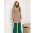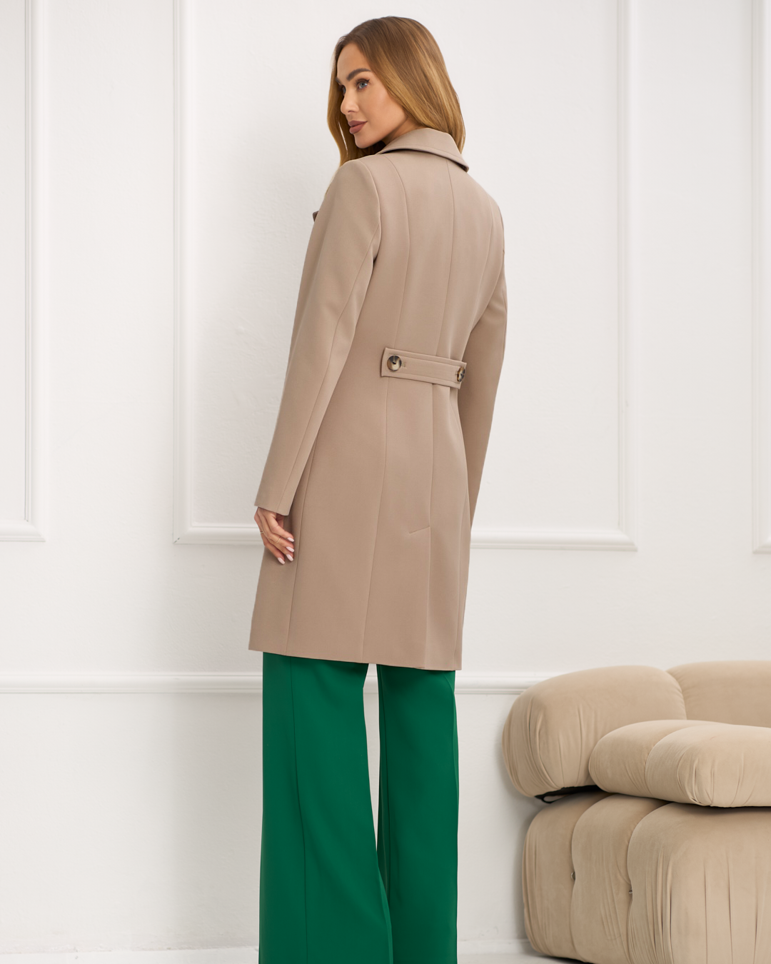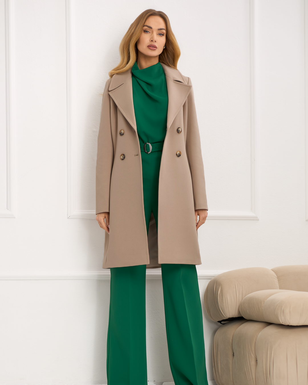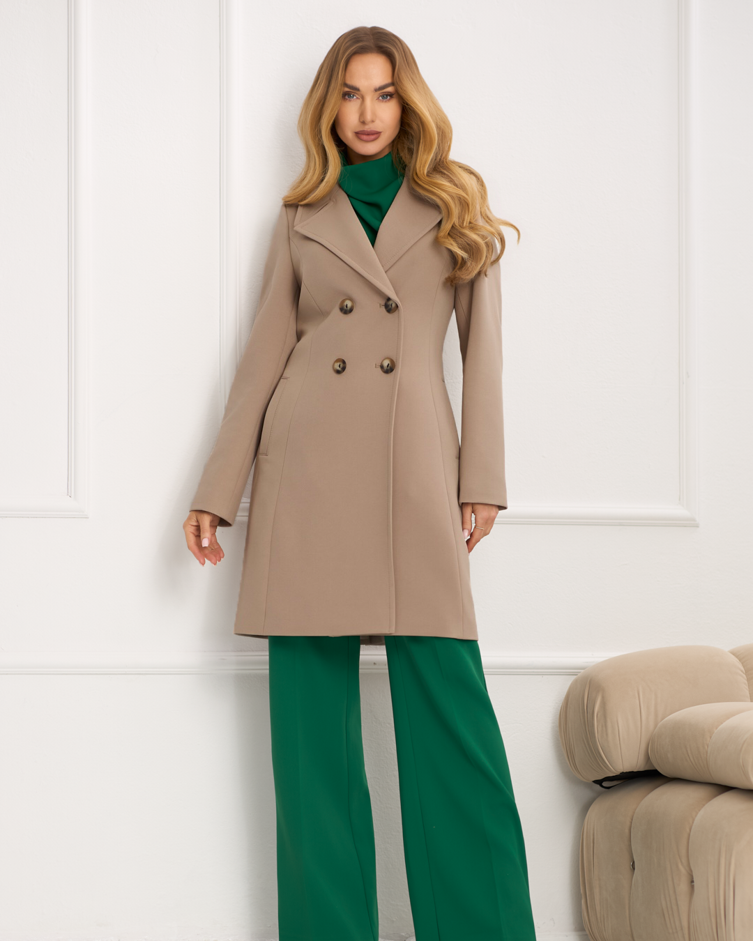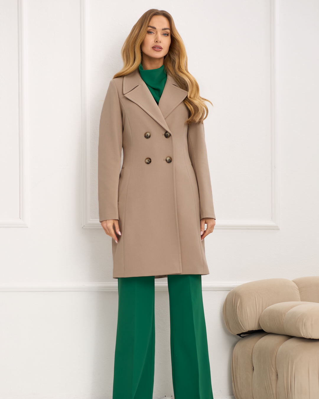 Paris to dopasowany, taliowany płaszcz o długości przed kolano, który emanuje niepowtarzalnym paryskim szykiem. Dwurzędowe guziki i kołnierz z klapami nadają mu elegancji, a rozporek z tyłu zapewnia lekkość i swobodę ruchu. Kieszenie po bokach łączą funkcjonalność z subtelnym stylem, a ozdobna patka z guzikami z tyłu dodaje wyjątkowego, modowego akcentu. Wykończony podszewką. Pięknie podkreśla kobiece kształty, pozwalając poczuć się jak w samym sercu paryskiej ulicy - elegancko, stylowo i z klasą.