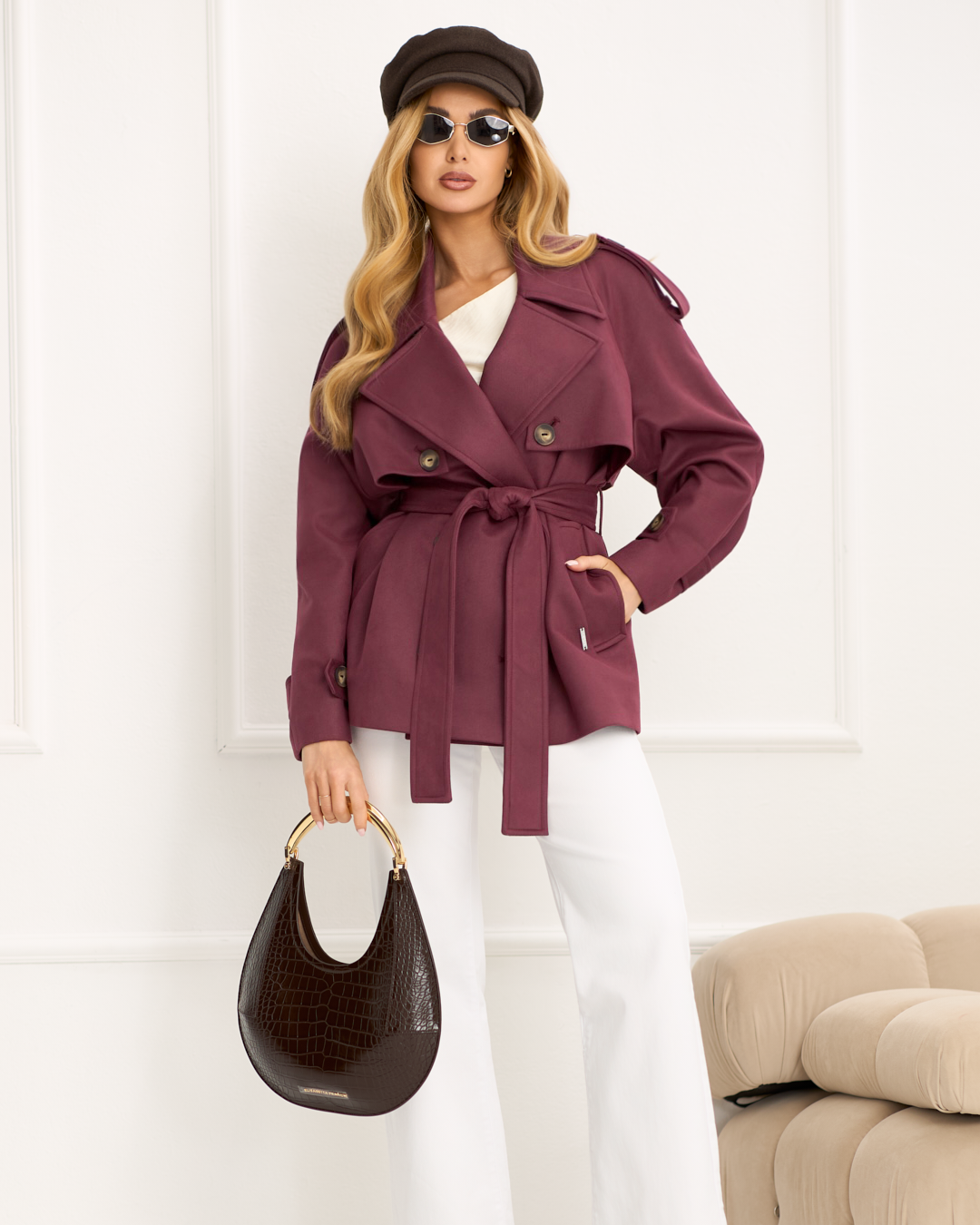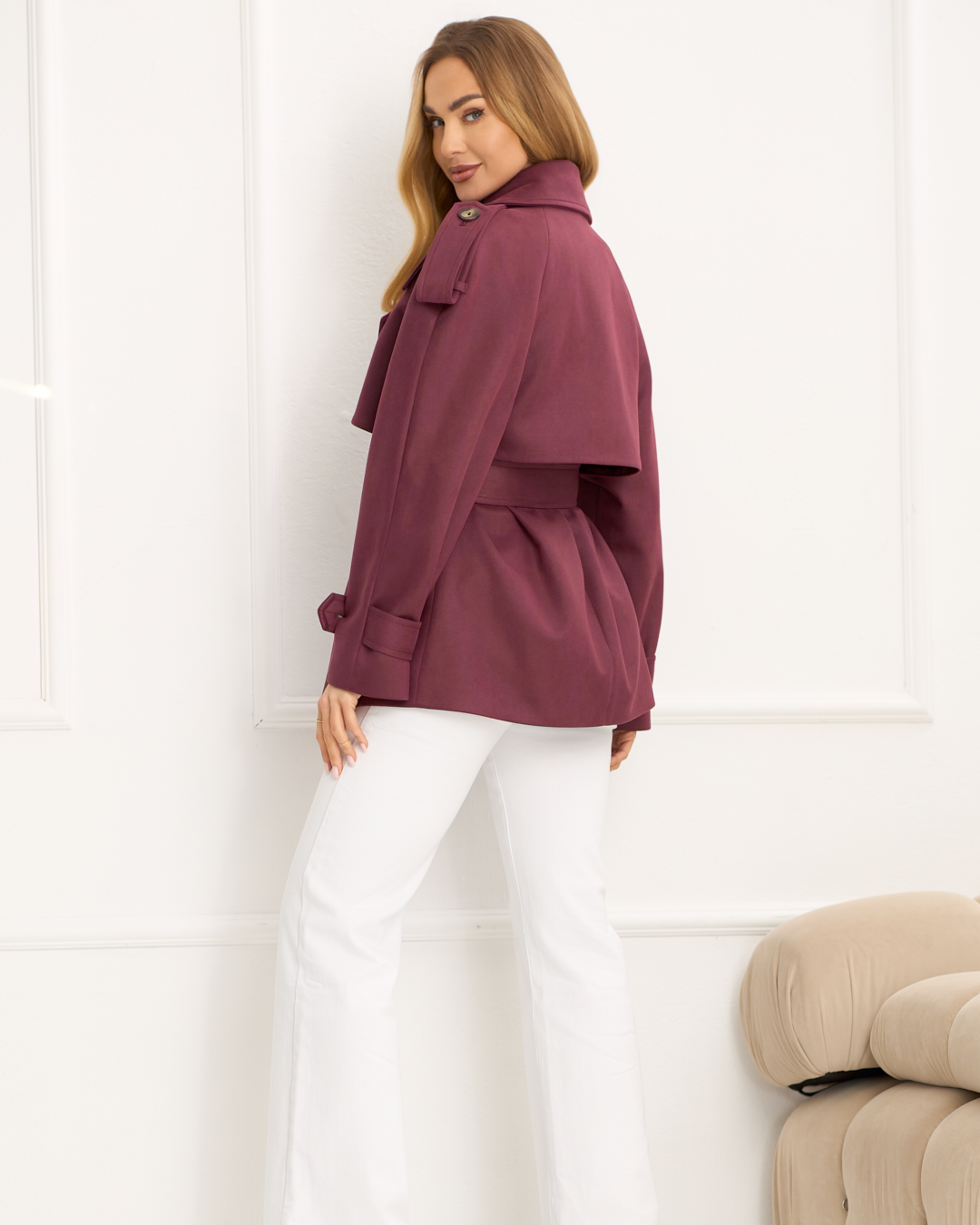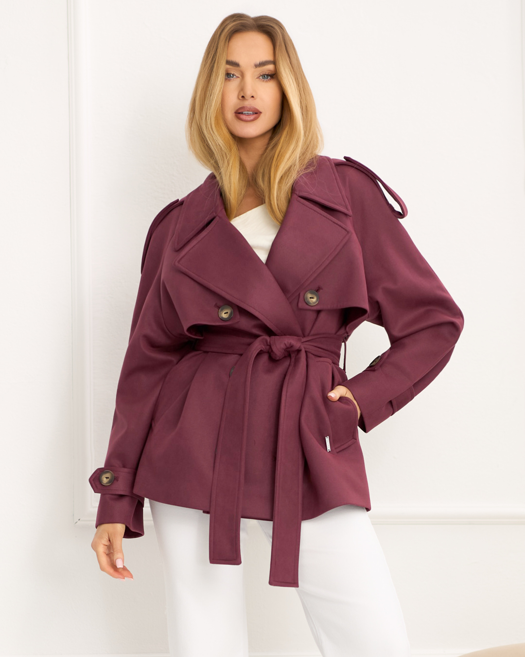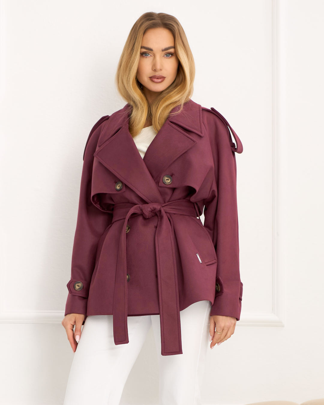 Sydney to modowy must-have sezonu. Luźniejszy fason przełamany paskiem w talii pięknie podkreśla kobieca sylwetkę, a raglanowe rękawy zapewniają swobodę i nowoczesną linię ramion. Patki na ramionach oraz na rękawach nadają całości wyrazisty, trenchowy charakter. Dwurzędowe zapięcie i szerokie klapy podkreślają jego stylowy look, a długość do bioder idealnie wpisuje się w miejskie, trendowe stylizacje. Model wykończony podszewką oraz wyposażony w kieszenie z patką łączy modny design z funkcjonalnością - idealny wybór na sezon wiosenny i jesienny.