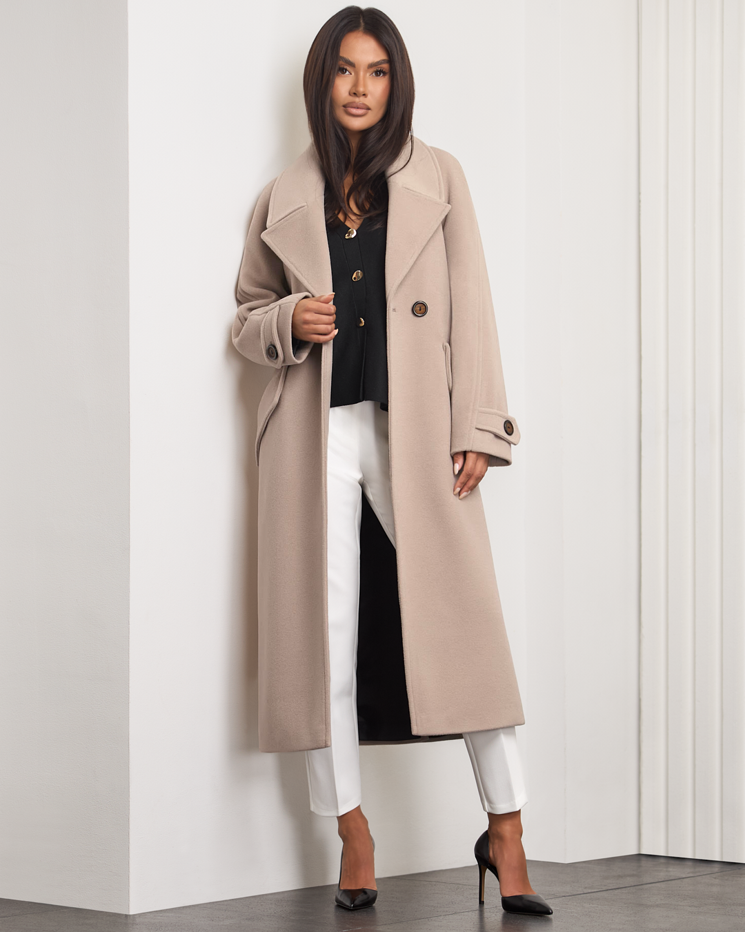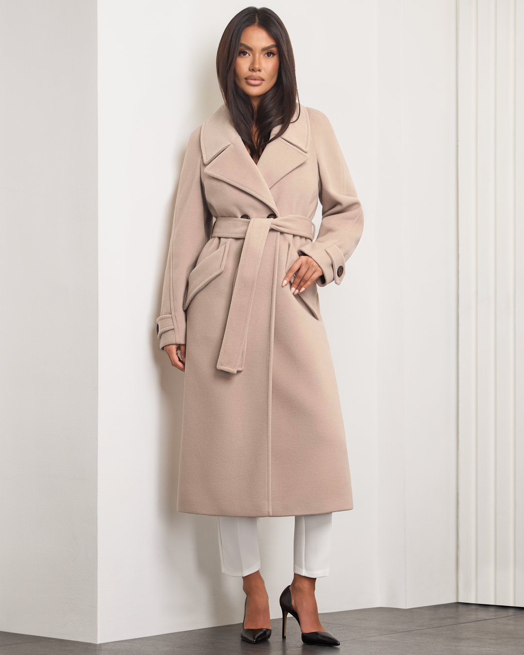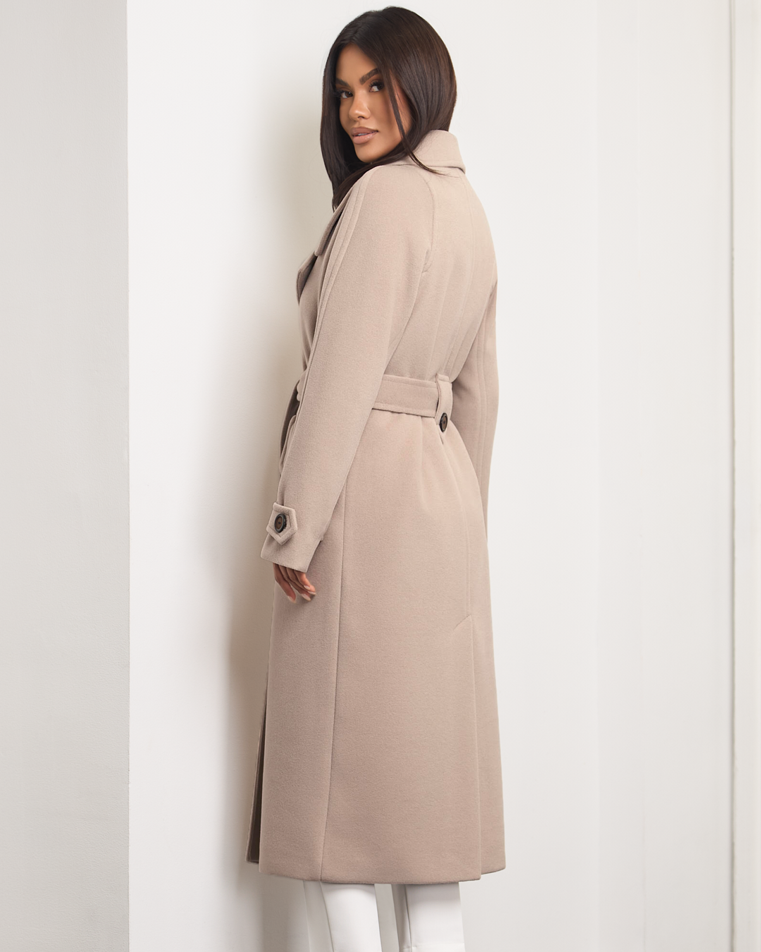 Tessa to długi, ocieplany płaszcz, o lużniejszym fasonie, który łączy klasykę z subtelną nutą nowoczesności. Kołnierz z klapami, zapinany na guziki podkreśla jego elegancki charakter, a pasek w talii pozwala nadać sylwetce idealne proporcje. Rękaw raglanowy zapewnia wygodę i swobodę ruchu, a kieszenie z patką wprowadzają praktyczny i jednocześnie stylowy detal. Rozporek z tyłu dodaje lekkości całości. Wykończony podszewką, otuli ciepłem w chłodniejsze dni, stając się niezawodnym wyborem na sezon jesień–zima.