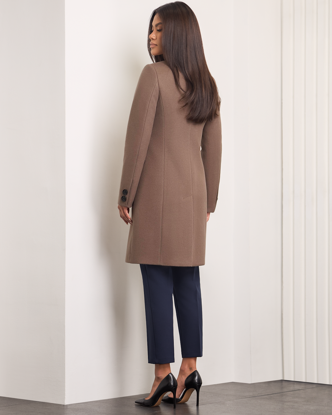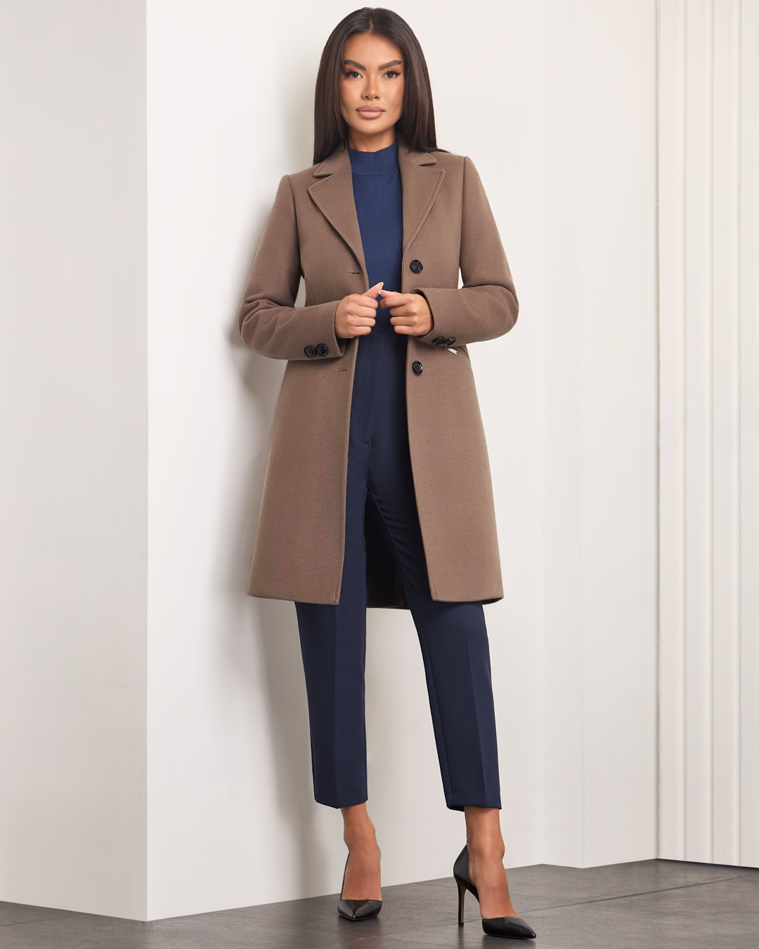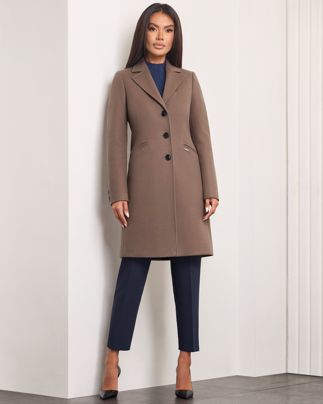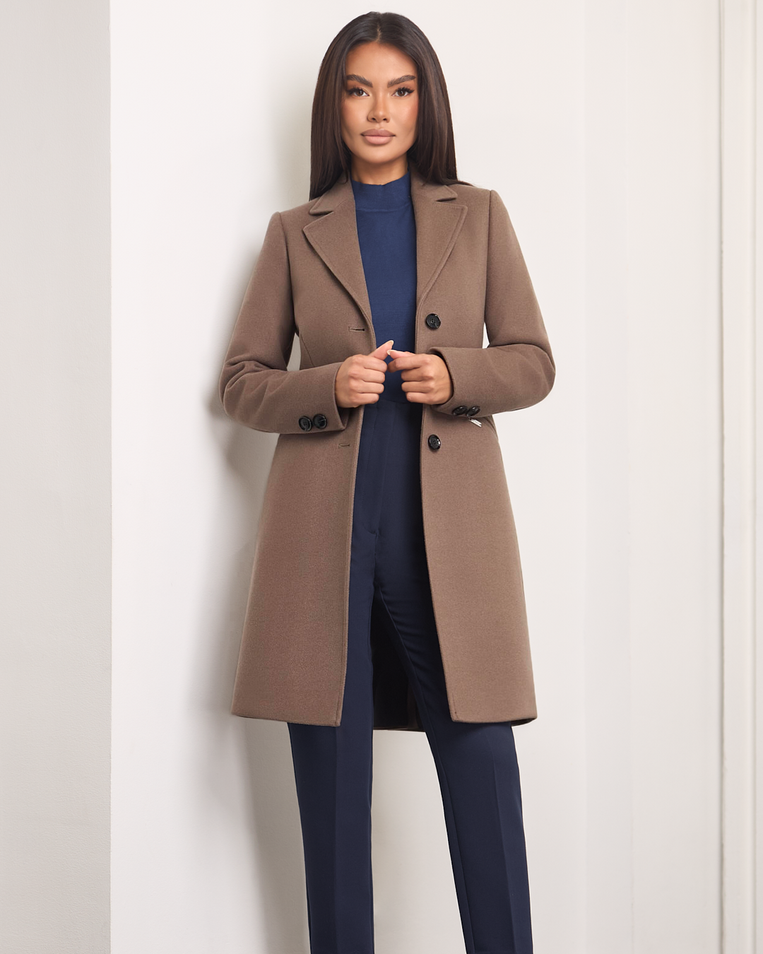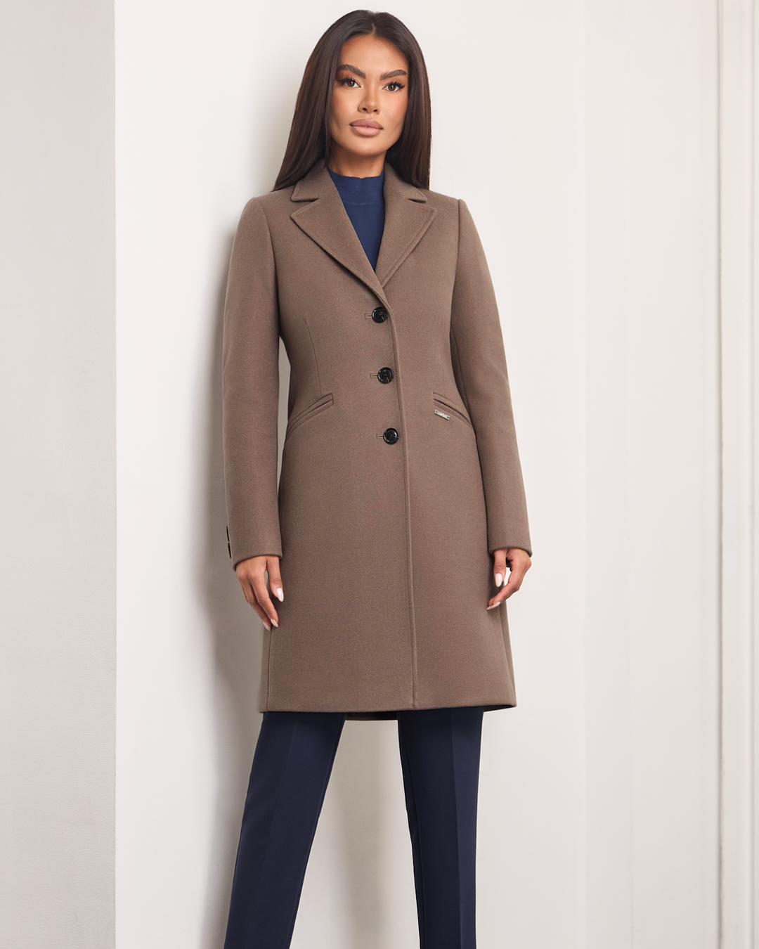 Tina to klasyczny, dopasowany model, który podkreśla sylwetkę i emanuje ponadczasową elegancją. Jednorzędowe zapięcie na guziki dodaje mu szyku, boczne kieszenie wprowadzają praktyczny akcent. Rozporek z tyłu zapewnia swobodę ruchu, a ocieplenie i miękka podszewka otulają przyjemnym ciepłem w chłodne dni. Długość przed kolano sprawia, że płaszcz doskonale komponuje się zarówno z codziennymi, jak i bardziej eleganckimi stylizacjami.