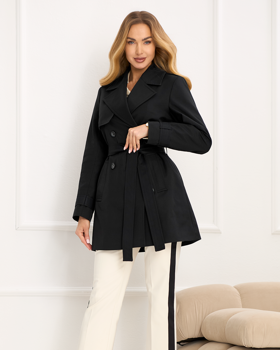 Zuri to ponadczasowy płaszcz inspirowany klasyką trencza w nowoczesnym wydaniu. Model posiada lekko swobodniejszy fason, który podkreśla talię paskiem, nadając sylwetce kobiecych proporcji. Dwurzędowe zapięcie oraz wyrazisty kołnierz z klapami podkreślają elegancki, miejski charakter płaszcza. Rękawy i ramiona wykończone patkami dodają klasycznego wyrazu, a długość do połowy uda sprawia, że model jest niezwykle uniwersalny i komfortowy w noszeniu. Model wykończony podszewką oraz wyposażony w praktyczne kieszenie łączy styl z funkcjonalnością, idealnie sprawdzając się w wiosennych stylizacjach.